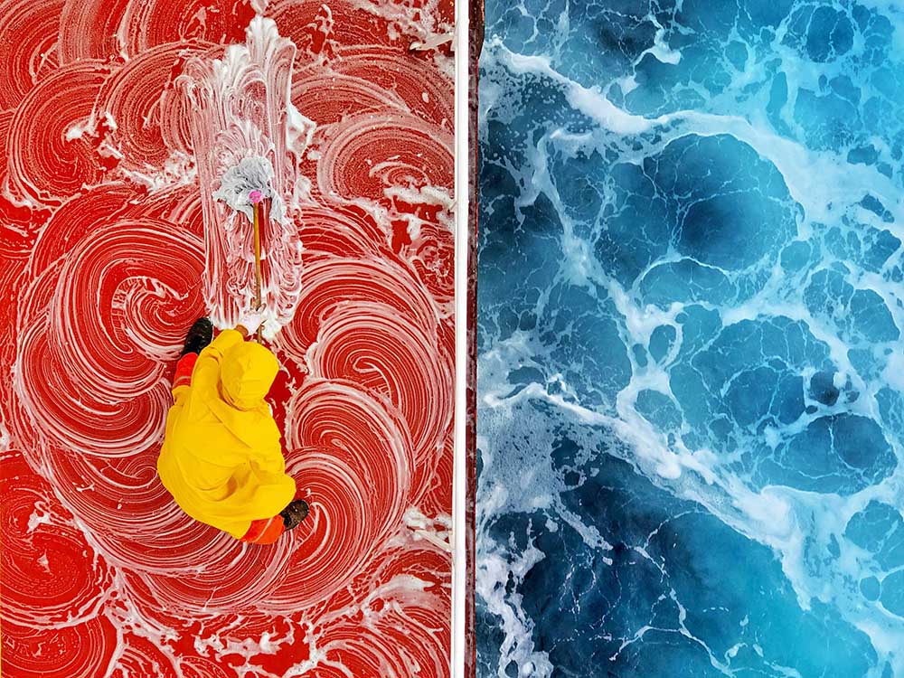 Submitted by Zay Yar Lin, a Master from Myanmar. The winning entry is a bold geometric composition, focusing on the deck of a ship and the blue ocean beneath. The overall effect is one of immediate visual drama but with clear underlying references to the swirling rhythms and patterns of life at sea and the solid dignity of the seafarer’s labour. All rights reserved, permission to use photo credit: IMO Day of the Seafarer photo competition, photo submitted by Zay Yar Lin (Myanmar)